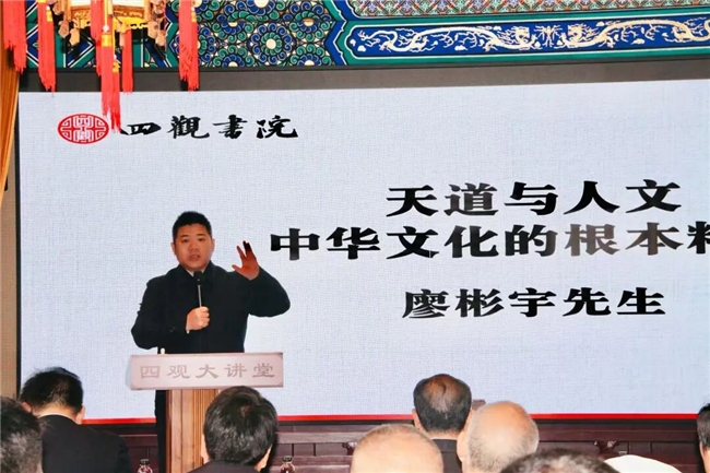 10月18日上午,四观书院国际学习会10期班开班仪式在四观书院北京总部举行。四观书院创始人、著名文化学者廖彬宇先生发表开班致辞,并主讲《天道与人文——中华文化的根本精神》。